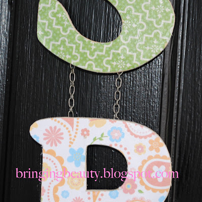 I cut squares of scrap paper to cover each letter. I glued the letters to the paper, then used my X-acto knife to cut around the letters. I sealed the paper on top using modge podge.